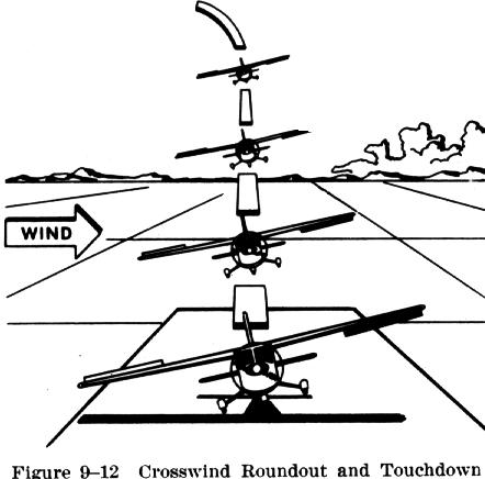 Since the airspeed decreases as the roundout progresses, the flight controls gradually become less effective; as a result, the crosswind correction being held would become inadequate. When using the wing low method then, it is necessary to gradually increase the deflection of the rudder and ailerons to maintain the proper amount of drift correction. Do not level the wings; keep the upwind wing down throughout the roundout. If the wings are leveled, the airplane will begin drifting and the touchdown will occur while drifting. Remember, the primary objective is to land the airplane without subjecting it to any side loads which result from touching down while drifting and to prevent ground looping while the landing is being accomplished.