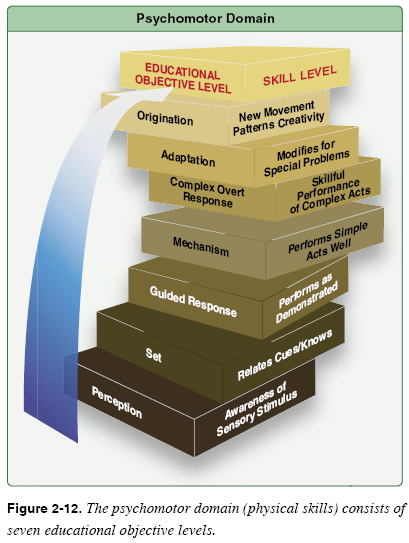 Psychomotor Domain The psychomotor domain is skill based and includes physical movement, coordination, and use of the motor-skill areas. [Figure 2-12] Development of these skills requires repetitive practice and is measured in terms of speed, precision, distance, and techniques. While various examples of the psychomotor domain exist, the practical instructional levels for aviation training purposes include observation, imitation, practice, and habit. This domain is an important component of instruction when aviation instructors prepare students for the practical test.