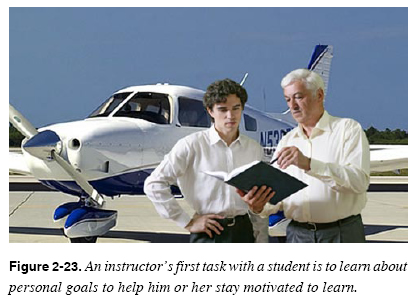 Where Does the Motivation To Learn Come From? Motivation to learn can come from many sources. Some students have a fundamental interest in aviation and experience sheer fascination with aircraft or with the experience of flight. Other students may decide that aviation provides an opportunity to develop a wide variety of technical, physical, communication, and problem-solving abilities. Some see aviation as a way to boost their self-image or ego. Other students are motivated by tradition and wish to follow in the footsteps of a relative or close friend. Some students are motivated to pursue aviation training because it offers a promising career. To others, aviation offers prestige or acceptance within social groups. Some may think that aviation offers fun and excitement or simply a more convenient form of transportation. All of these sources of motivation have one thing in common: they all offer some type of reward in exchange for performing the hard work. Teaching the adult learner was discussed in chapter 1, but aviation instructors should keep in mind that adult learners who are motivated to seek out a learning experience do so primarily because they have a use for the knowledge or skill being sought. Learning is a means to an end, not an end in itself. Based on this, it is important instructors determine why a student enrolled in the course. Based on preference and/or class size, an instructor can conduct a brief personal interview with the student or have the student complete a student information form. [Figure 2-23] Asking questions such as “Why are you taking this course?” or “How do you plan to use the information you learn in this course?” may be all that is necessary.