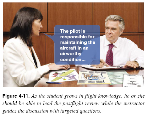 Advantages As with any training method that involves discussion, students are encouraged to listen to and learn from their instructor and/or each other. Also as mentioned earlier, discussion involves critical thinking skill. Open-ended questions of the type used in guided discussion lend themselves readily to concepts of risk management and ADM. The constant use of “What If?” discussions provide the student with increased exposure to proper decision-making. From the description of guided discussion, it is obvious this method works best in a group situation, but it can be modified for an interactive one-on-one learning situation. [Figure 4-11] Planning the guided discussion as well as learning how to ask the type of questions used in guided discussions are assets for any aviation instructor.