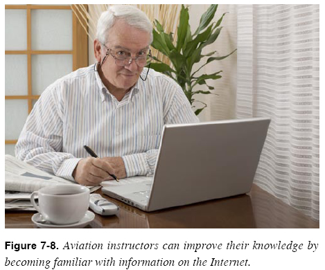 Educational/Training Institutions Professional aviation instructors can further increase their knowledge and skill in aviation specialties by attending classes at local community colleges, technical schools, or universities. These schools may offer complete degree programs in aviation subjects as well as single-subject courses of benefit to instructors. Commercial Organizations Commercial organizations are another important source of education/training for the aviation instructor. Some may be publishers of training materials while others may provide complete ground and flight training programs for professional pilots and instructors. These companies often provide a wide variety of study programs including videos, computer-based training, and printed publications. Many offer training that can be attended either at the home base of the company or in traveling classes/seminars so instructors can more easily attend. There are numerous organizations around the country that offer courses of training for aviation instructors. These are generally courses that are available to all pilots and technicians, but are especially useful for instructors to improve their abilities. Examples of such courses include workshops for maintenance technicians to enhance their skills in subjects such as composites, sheet metal fabrication, and fabric covering. For pilots there are courses in mountain flying, spin training, and tail wheel qualification. Flight instructors also may increase their aviation knowledge and experience by adding additional category and class ratings to their certificates. Industry Organizations Other significant sources of ongoing education for aviation instructors are aviation organizations. These organizations not only provide educational articles in their publications, but also present training programs or cosponsor such programs. Many industry organizations have local affiliated chapters that make it easy to meet other pilots, technicians, and instructors. These meetings frequently include presentations by industry experts, as well as formal training sessions. Some aviation industry organizations conduct their own training sessions on areas such as flight instructor refresher clinics and Inspection Authorization (IA) seminars. Properly organized safety symposiums and training clinics are valuable sources of refresher training. They are also an excellent opportunity to exchange information with other instructors. Sources of Material An aviation instructor should maintain access to current flight publications or maintenance publications. For the flight instructor, this includes current copies of regulations pertinent to pilot qualification and certification, Aeronautical Information Manual (AIM), appropriate Practical Test Standards (PTS), and pilot training manuals. The aviation maintenance instructor should have copies of applicable regulations, current knowledge and PTS, and maintenance training manuals. Aviation instructors must be thoroughly familiar with current certification and rating requirements in order to provide competent instruction. AC 00.2-15, Advisory Circular Checklist, is a listing of all current advisory circulars and other FAA publications sold by the Superintendent of Documents, U.S. Government Printing Office (GPO) or available online at www.faa.gov/. Many of the advisory circulars should be considered by the aviation instructor for inclusion in a personal reference library. In addition to government publications, a number of excellent handbooks and other reference materials are available from commercial publishers. Aviation periodicals and technical journals from the aviation industry are other sources of valuable information for instructors. Many public and institutional libraries have excellent resource material on educational psychology, teaching methods, testing, and other aviation related subjects. The aviation instructor has two reasons to maintain a source of current information and publications. First, the instructor needs a steady supply of fresh material to make instruction interesting and up to date. Second, instructors should keep themselves well informed by maintaining familiarity with what is being written in current aviation publications. Most of these publications are in printed form, but increasingly, information is available through electronic means. [Figure 7-8]