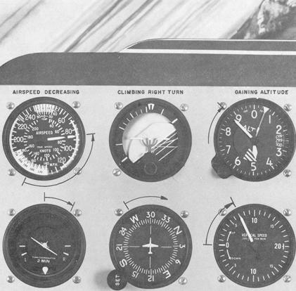 Nose-high attitudes (Fig. 5-41) are shown by the rate and direction of movement of the altimeter needle, vertical-speed needle, and airspeed needle, as well as the immediately recognizable indication of the attitude indicator (except in extreme attitudes). Nose-low attitudes (Fig. 5-42) are shown by the same instruments, but in the opposite direction.
