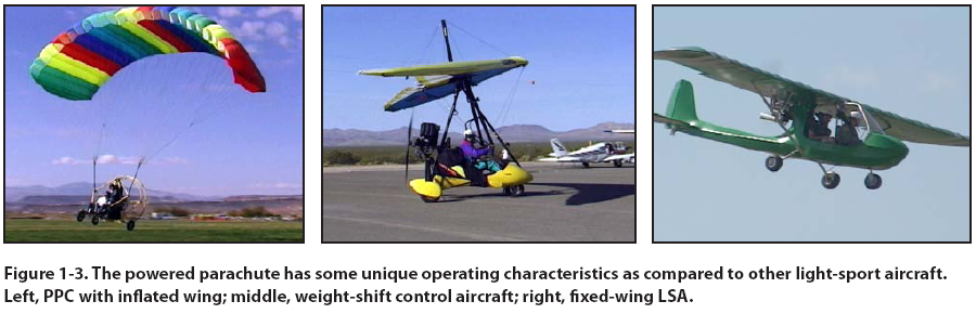 Chapter 1 - Introduction to the Powered Parachute Powered Parachute Terms Different terms have been used throughout the powered parachute community. [Figure 1-2] The terms standardized throughout this book are as follows: • Powered Parachute – The complete aircraft. • Cart – The engine and seats, attached by a structure to wheels; may also be referred to as the fuselage, cockpit, chaise, or airframe. • Wing – Typically a ram-air inflated and pressurized wing including lines that attach to the cart. The wing is not in position to fly until the aircraft is in motion; when not inflated, referred to as a parachute or chute. Introduction to the Powered Parachute The powered parachute is a category of aircraft that flies in a manner unique among light-sport aircraft. Three significant differences separate the PPC from other types of light sport aircraft (LSA): [Figure 1-3] 1. The wing must be inflated and pressurized by ram air prior to each takeoff. 2. The aircraft uses a pendulum configuration, where the cart hangs about 20 feet below the wing, connected via flexible suspension lines. 3. The wing is at a relatively fixed angle with the suspension lines and flies at a relatively constant speed. Other aircraft categories allow pilots to change the speed of the aircraft, but the powered parachute airspeed remains within a very small range. A powered parachute can be a single place ultralight flying vehicle, a single place light-sport aircraft, or a multi-place light-sport aircraft. The common acronyms for this vehicle/aircraft are PPC (powered parachute), PPCL (powered parachute land) or PPCS (powered parachute sea). A light-sport aircraft PPC used for sport and private flying must be registered with an FAA N-number, have an airworthiness certificate, a pilot’s operating handbook (POH), and/or limitations with a weight and balance document aboard. The aircraft must be maintained properly by the aircraft owner or other qualified personnel and have the aircraft logbooks available for inspection. Dual controls are required in the aircraft for training. Powered Parachute Pilot Certificate Eligibility Requirements You may not act as pilot in command (PIC) of a lightsport aircraft powered parachute unless you hold a pilot certificate with a powered parachute rating issued by the FAA. At this time the only pilot certificates with powered parachute ratings are Student, Sport and Private. The FAA is empowered by the U.S. Congress to promote aviation safety by prescribing safety standards for pilots and the other civil aviation programs. The Code of Federal Regulations (CFRs), formerly referred to as Federal Aviation Regulations (FARs), are one of the primary means of conveying these safety standards. Title 14 CFR, part 61 specifies the requirements to earn a pilot certificate. This regulation also states the pilot applicant must be able to read, speak, write, and understand the English language. The FAA Practical Test Standards (PTS) establish the standards for the knowledge and skills necessary for the issuance of a pilot certificate. [Figure 1-4] You should reference both these documents to understand the knowledge, skills and experience required to obtain a pilot certificate to fly a powered parachute. Pilot applicants must have a valid U.S. driver’s license or a current third-class medical certificate issued under 14 CFR part 67. If you use your valid driver’s license to exercise the privileges of a Sport Pilot certificate, then you must also adhere to any restrictions on that driver’s license. You must hold a current thirdclass medical certificate to exercise the privileges of a Private Pilot certificate. The process of learning to fly includes a combination of ground training (to include successful completion of the FAA Knowledge Exam) and flight training to include dual flights with a certified flight instructor (CFI), as well as solo flights under the supervision of your CFI. To be eligible to fly solo in a PPC, you must be at least 16 years of age and demonstrate satisfactory aeronautical knowledge on a test developed by your instructor. You must have received and logged flight training for the maneuvers and procedures in 14 CFR part 61 for the PPC, as well as demonstrated satisfactory proficiency and safety. Only after all of these requirements are met can your instructor endorse your student pilot certificate and logbook for solo flight. Once you obtain the required aeronautical knowledge and experience required by 14 CFR part 61, your flight instructor will endorse you to take a practical test (often called a “checkride”) with a sport pilot examiner (SPE) or an FAA inspector. After you’ve demonstrated satisfactory aeronautical knowledge and skill in the Areas of Operation and Tasks outlined in the PTS, this examiner or inspector will issue your temporary (paper) pilot certificate. You will receive a plastic certificate in the mail once the results of the practical test are received by the FAA Registration branch. A sport pilot is certified to fly a light-sport aircraft. To be eligible for a sport pilot certificate with a powered parachute rating, you must be at least 17 years of age, complete the specific training and flight time requirements described in 14 CFR part 61 subpart J, pass the FAA Knowledge Exam, and successfully complete the practical test. If you hold at least a private pilot certificate, but not a rating for the category and class of PPC LSA, you can operate the powered parachute with a logbook endorsement and passing a proficiency check. [Table 1] If you hold at least a private pilot certificate with a PPC category and class rating, and have a current third-class medical, then you may operate any PPC LSA in that category and class, and do not need to hold any of the endorsements required by Sport Pilots, nor do you need to comply with the limitations of a Sport Pilot certificate.