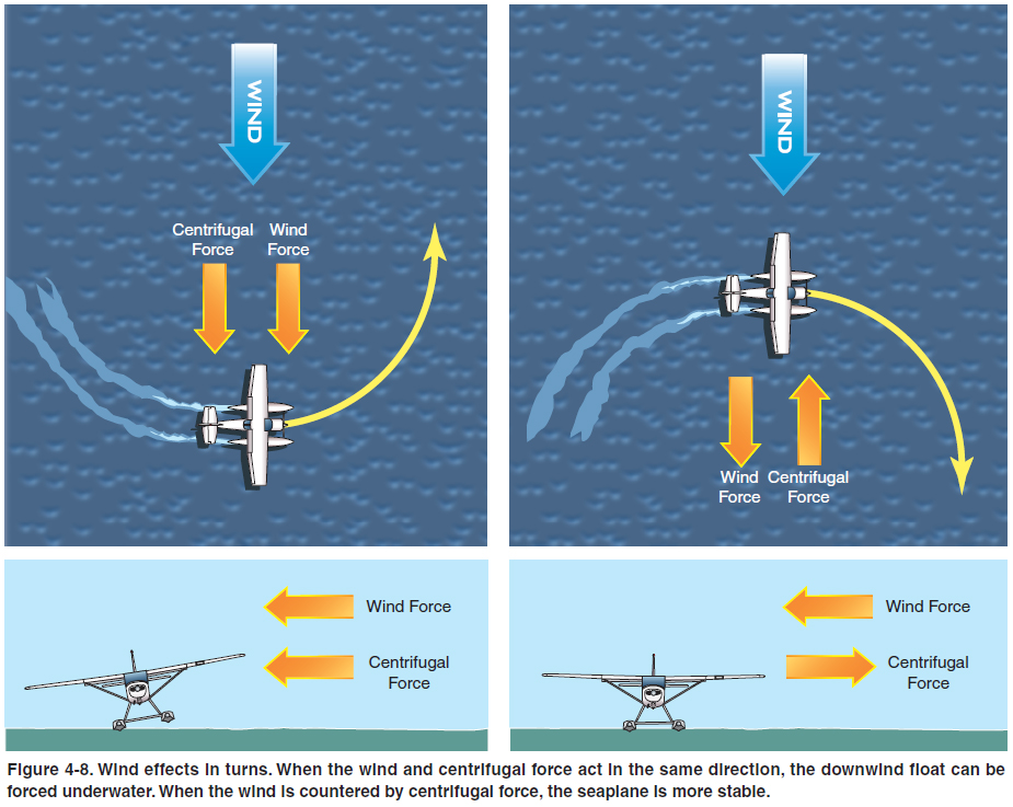 During a high speed taxiing turn, centrifugal force tends to tip the seaplane toward the outside of the turn. When turning from an upwind heading to a downwind heading, the wind force acts in opposition to centrifugal force, helping stabilize the seaplane. On the other hand, when turning from downwind to upwind, the wind force against the fuselage and the underside of the wing increases the tendency for the seaplane to lean to the outside of the turn, forcing the downwind float deeper into the water. In a tight turn or in strong winds, the combination of these two forces may be sufficient to tip the seaplane to the extent that the downwind float submerges or the outside wing drags in the water, and may even flip the seaplane onto its back. The further the seaplane tips, the greater the effect of the crosswind, as the wing presents more vertical area to the wind force. [Figure 4-8]