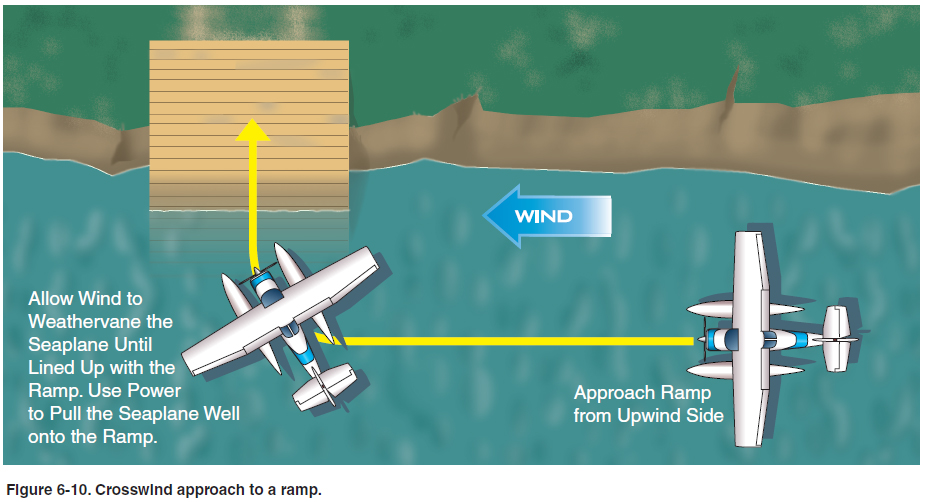 Experience and proficiency are necessary for ramping in strong winds. In many instances, the safest procedure is to taxi upwind to the ramp and near enough for a helper to attach a line to the floats. The seaplane may then be left floating, or pushed and pulled into a position where a vehicle can haul it up the ramp. |
