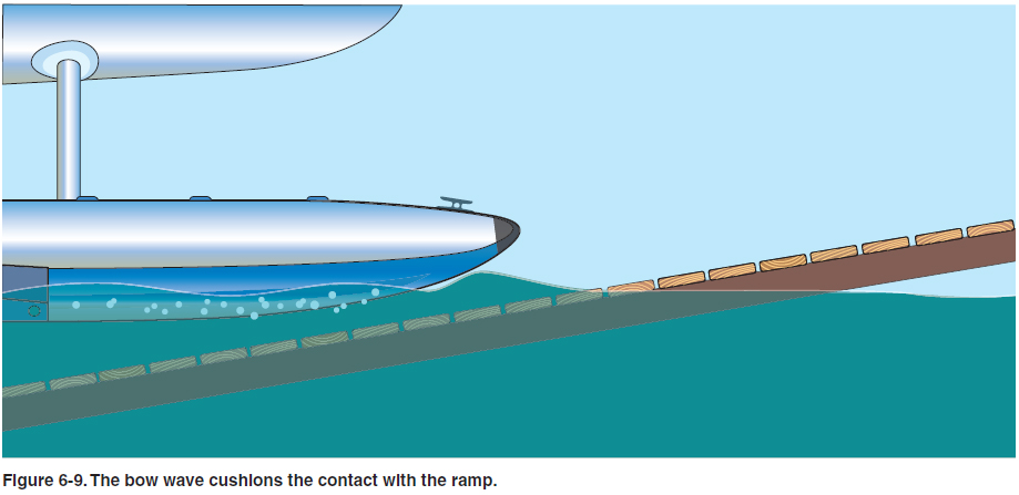 DOCKING The procedure for docking is essentially the same as for mooring, except that approaching directly into the wind may not be an option. The keys to successful docking are proper planning of the approach to the dock, compensating for the existing environmental conditions, and skill in handling the seaplane in congested areas. Bear in mind that a seaplane is fragile and hitting an obstruction can result in extensive damage. Plan the approach to the dock so as to keep the wind on the seaplane’s nose as much as possible. While still well clear of the dock area, check the responsiveness of the water rudders and be sure the seaplane will be able to maneuver in the existing wind and current. If control seems marginal, turn away and plan an alternative method of reaching the dock. While approaching the dock, the person who will be jumping out to secure the seaplane should take off seatbelts and unlatch the door. When it is clear that the seaplane will just make it to the dock, shut down the engine and let the seaplane coast the remaining distance to encounter the dock as gently as possible. The person securing the seaplane should step out onto the float, pick up the mooring line attached to the rear float strut, and step onto the dock as the seaplane stops. The line should be secured to a mooring cleat on the dock. Use additional mooring lines if the seaplane will be left unattended. Be sure to complete any remaining items on the checklist, and to double-check that the mixture, magnetos, and master switch are in the off positions. BEACHING Success in beaching depends primarily on the type and firmness of the shoreline. Inspect the beach carefully before using it. If this is impossible, approach the beach at an oblique angle so the seaplane can be turned out into deeper water if the beach is unsatisfactory. The hardest packed sand is usually near the water’s edge and becomes softer where it is dry, further from the water’s edge. Rocky shorelines are likely to damage the floats, especially if significant waves are rolling in. Mud bottoms are usually not desirable for beaching. To protect them from damage, water rudders should be up before entering the shallow water near a beach. Sand is abrasive and erodes any protective coatings on the bottoms of the floats. If possible, beach the seaplane by sailing backward with the water rudders up. The aft bottoms of the floats do not dig into the sand as deeply as the forward bottoms, so backing onto a beach is not as hard on the floats as going in nose-first. Do not leave the seaplane unattended unless at least a tail line is fastened to some solid object ashore. Moderate action of the water rapidly washes away the sand under the floats and lets the seaplane drift. An incoming tide can float a beached seaplane in just a few minutes. Likewise, a receding tide may leave a seaplane stranded 30 or 40 feet from the water in a few hours. Even small waves may alternately pick up and drop the seaplane, potentially causing serious damage, unless the seaplane is beached well out of their reach. Flying boat pilots should be sure to clear the main gear wells of any sand or debris that may have accumulated before departing. If the seaplane is beached overnight or higher winds are expected, use portable tiedowns or stakes driven into firm ground and tie it down like a landplane. If severe winds are expected, the compartments of the floats can be filled with water. This holds the seaplane in very high winds, but it is a lot of work to pump out the floats afterward. RAMPING For the purpose of this discussion, a ramp is a sloping platform extending well under the surface of the water. If the ramp is wood, the seaplane can be slid up or down it on the keels of the floats, provided the surface of the ramp above the water is wet. Concrete boat ramps are generally not suitable for seaplanes. Water rudders should be down for directional control while approaching the ramp, but raised after the seaplane hits the ramp. If the wind is blowing directly toward the shore, it is possible to approach the ramp downwind with enough speed to maintain control. Continue this speed until the seaplane actually contacts the ramp and slides up it. Many inexperienced pilots make the mistake of cutting the power before reaching the ramp for fear of hitting it too hard. This is more likely to result in problems, since the seaplane may weathervane and hit the ramp sideways or backward, or at least need to be taxied out for another try. When approaching at the right speed, the bow wave of the float cushions the impact with the ramp, but if the seaplane is too slow or decelerating, the bow wave moves farther back along the float and the impact with the ramp may be harder. Many pilots apply a little power just prior to hitting the ramp, which raises the fronts of the floats and creates more of a cushioning bow wave. Be sure to hold the elevator control all the way back throughout the ramping. [Figure 6-9]