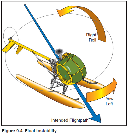 OPERATIONAL CONSIDERATIONS Helicopter floats have only a mild effect on aircraft performance, with just a slight weight penalty and reduction in cruise speed. However, the large surface area of the floats makes the helicopter very sensitive to any departure from coordinated flight. For example, in cruise flight, any yawing causes the helicopter to roll in the opposite direction, as shown in figure 9-4. A failure of the engine requires immediate pedal application to prevent an uncontrollable yaw, with a resulting roll.