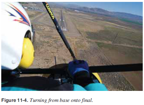 For landings where throttle is required, the foot throttle is typically used so the hands can stay on the control bar while approaching the ground for this critical phase of fl ight. However, the hand/cruise throttle may be set above idle for specifi c situations as required by the pilot. Higher power settings for approaches and landings are discussed later in this chapter. Base Leg The placement of the base leg is one of the more important judgments made by the pilot in any landing approach. [Figure 11-1] The pilot must accurately judge the altitude and distance from which the descent results in landing at the desired point.