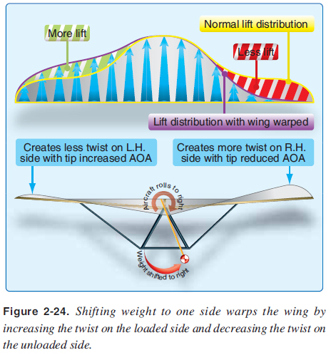 CHAPTER 2. Aerodynamics Longitudinal Axis— Roll Turning is initiated by rolling about the longitudinal axis, into a bank similar to an airplane using aileron and rudder control. To turn, shift the weight to the side in the direction of the turn, increasing the weight on that side. This increases the twist on that side while decreasing the twist on the other side, similar to actuating the ailerons on an airplane. The increased twist on the side with the increased weight reduces the AOA on the tip, reducing the lift on that side and dropping the wing into a bank. The other wing, away from which the weight has been shifted, decreases twist. The AOA increases, increasing the lift on that wing and thereby raising it. Thus, shifting the weight to one side warps the wing (changes the twist) to drop one wing and raise the other, rolling the WSC aircraft about the longitudinal axis. [Figure 2-24] More details on the controls that assist wing warping are covered in chapter 3, which should be considered with use of the controls in the takeoff, landing, and fl ight maneuvers sections of this handbook. ![]() Vertical Axis— Yaw The WSC wing is designed to fl y directly into the relative wind because it does not provide for direct control of rotation about the vertical axis. Stability and Moments A body that rotates freely turns about its CG. In aerodynamic terms for a WSC aircraft, the mathematical value of a moment is the product of the force times the distance from the CG (moment arm) at which the force is applied. Typical airplane wings generally pitch nose down or roll forward and follow the curvature of the upper airfoil camber creating a negative pitching moment. One of the reasons airplanes have tails is to create a downward force at the rear of the aircraft to maintain stabilized fl ight, as explained in greater detail in the Pilot’s Handbook of Aeronautical Knowledge. The WSC wing is completely different and does not need a tail because of two specifi c design differences—a completely different airfoil design creating a more stable airfoil and lifting surfaces fore and aft of the CG, similar to the airplane canard design. WSC Unique Airfoil and Wing Design As shown in Figure 2-2, the WSC airfoil has the high point signifi cantly farther forward than does the typical airplane airfoil. This makes the center of lift for the airfoil farther forward and creates a neutral or positive pitching moment for the airfoil. Most WSC airfoils have this unique design to minimize negative moments or pitch down during fl ight. Additionally, the design of the complete wing is a unique feature that provides stability without a tail. To understand the WSC aircraft pitch stability and moments, examine the wing as two separate components—root chord and tip chord. Trim—Normal Stabilized Flight In Figure 2-25A, during normal unaccelerated fl ight at trim speed, the lift at the root (LR) times the arm to the root (AR) equals the lift of the tip (LT) times the arm to the tip (AT). (LR x AR) + (LT x AT) = 0 LR + LT = Total Lift of the Wing (LW) Adding all the lift from the wing puts the center of lift of the wing (CLW) directly over the CG for stabilized fl ight. [Figure 2-25A] If the pilot wishes to increase the trim speed, the CG is moved forward. This is done by moving the hang point forward on the wing. Similarly, to reduce the trim speed, the hang point/CG is moved rearward on the wing. ![]() High Angles of Attack In Figure 2-25B, if the wing AOA is raised to the point of minimum controlled airspeed at which the wing begins to stall towards the center of the wing (root area), the lift in this area decreases dramatically. The CLW moves back a distance “b” creating a moment to lower the nose. Therefore, the center of lift moves behind the CG at higher angles of attack, creating a nose-down stabilizing moment. The average lift coeffi cient verses AOA is shown for this minimum controlled airspeee root area is partially stalled and the tips are still fl ying. The specifi c stall characteristics of each wing are different and this stall pattern shown here id in Figure 2-26. Ths used for example. ![]() |