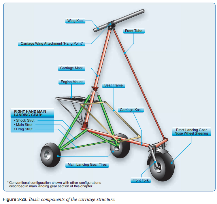 Similar to the wing, the carriage is designed with a number of structural triangles for optimum strength and minimum weight. Each manufacturer and model have specific details that vary, but the carriage structure is typically a mast, keel, and front tube that form the main triangle components of the carriage structure with the wing attachment at the top of the mast. A seat frame attached to the mast and keel provides rigidity to the main components while providing structure for the pilot and passenger. [Figure 3-26]