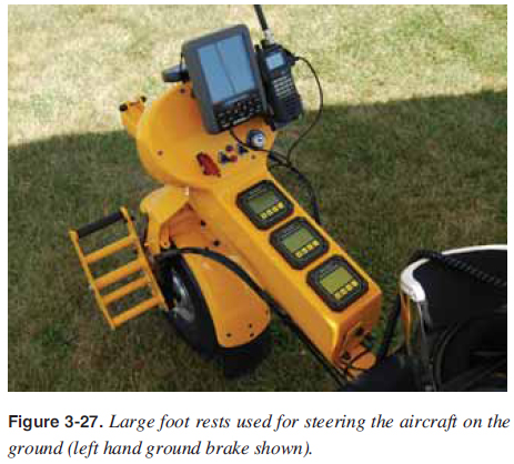 The landing gear is made up of the front wheel, which has a lighter load and is used for steering, and the main or rear landing gear, which takes most of the load for the aircraft. [Figure 3-26] The front steering fork for the nosewheel has foot rests attached that the pilot uses for steering the WSC aircraft on the ground. Besides ground steering, the foot controls are similar to driving a car, left foot pedal is brakes on the ground only, and right foot is throttle and power on the ground and in fl ight. [Figure 3-27] The front fork typically has camber so it naturally tracks in the direction of travel similar to a motorcycle front fork.