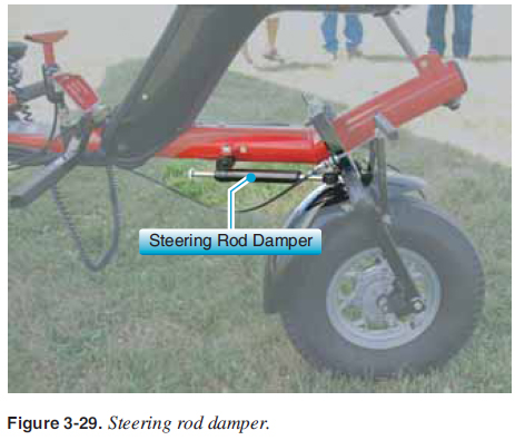 For training, a second steering control is installed with a connecting rod so the instructor can sit in back and steer the carriage on the ground using the nosewheel. [Figure 3-28] Steering dampers are sometimes used to stabilize the front wheel from shimmying at higher speeds during takeoff and landing. [Figure 3-29] The front wheel sometimes has shock absorbers or the tire itself can act as the shock absorber. The front wheel typically has a disk or a drum brake, mechanical or hydraulic. [Figures 3-30 and 3-31] A front brake is lighter and simpler than rear brakes, but some carriage brake systems utilize the rear brakes.