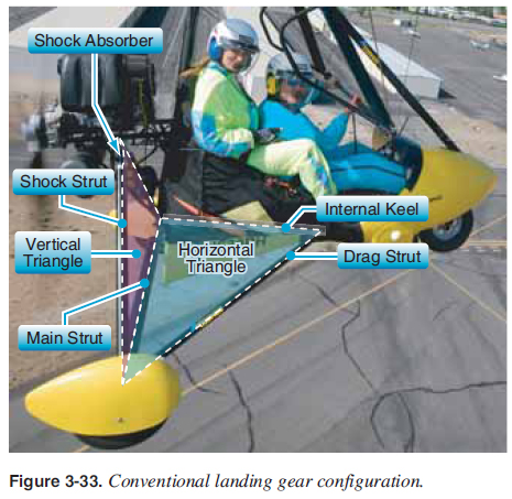 The vertical triangle consists of the main landing strut and the shock strut attached to the wheel and up to the keel structure [Figure 3-36] or other structure such as the engine mount shown in Figure 3-33, which houses the compressed nitrogen and oil “oleo” shock absorber.
