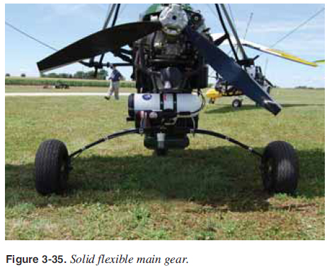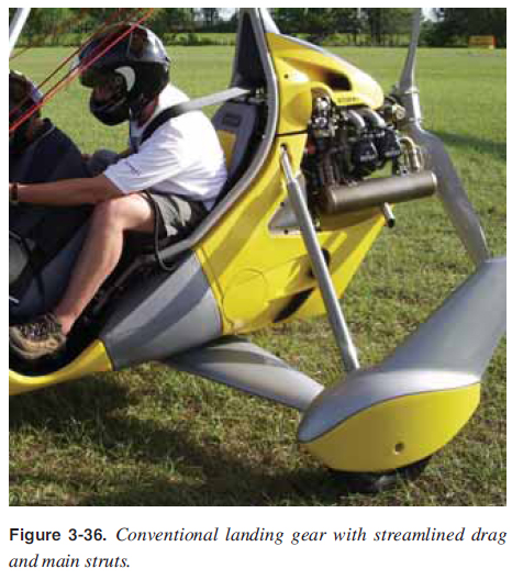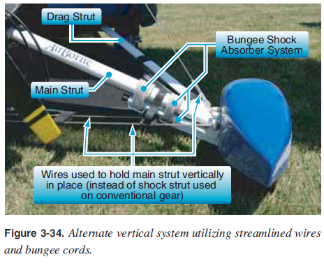 There are a number of other main landing gear confi gurations and shock absorbing systems such as wire bracing with bungee cord shocks [Figure 3-34], fiberglass or flexible (fiberglass or steel) main gears with no struts [Figure 3-35], and any variation of these. Carriages designed for faster speeds may have streamlined landing gear systems. [Figures 3-36 and 3-37]