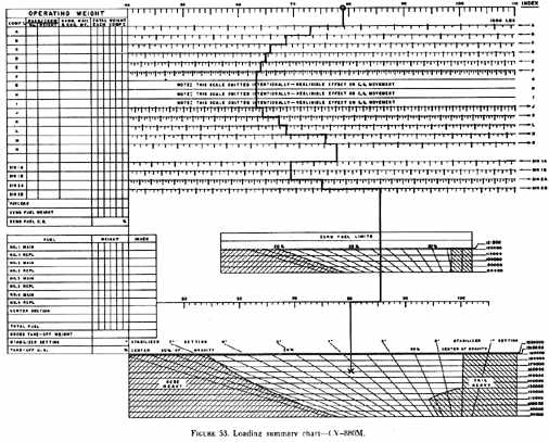 LOADING SUMMARY CHART. A typical approach to the problem of finding c.g. quickly is found in the use of a loading summary chart. Representative loading summary charts are shown in figures 52 and 53. These charts provide a means for determining c.g. position with some of the arithmetic steps omitted. Generally, the charts are entered at the top with basic operating weight and its index. Then a line is drawn downward and corrections are made to the right or left as appropriate for loads in each compartment. When all the compartment loads are considered, the line will indicate the zero fuel weight index. Continuing the line downward, a right or left adjustment is made for fuel load. The line is then terminated in the grid section of the chart at a horizontal line which represents the total weight. The terminal point of the line is an indication of c.g. in % MAC or index. Many turbojet aircraft load summary charts will provide an answer directly in stabilizer setting increments.