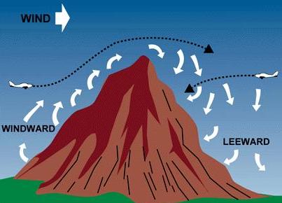 | The stronger the wind, the greater the downward pressure and the accompanying turbulence. Consequently, in approaching a hill or mountain from the leeward side, a pilot should gain enough altitude well in advance. Because of these downdrafts, it is recommended that mountain ridges and peaks be cleared by at least 2,000 feet. If there is any doubt about having adequate clearance, the pilot should turn away at once and gain more altitude. Between hills or mountains, where there is a canyon or narrow valley, the wind will generally veer from its normal course and flow through the passage with increased velocity and turbulence. A pilot flying over such terrain needs to be alert for wind shifts, and particularly cautious if making a landing. | ![]() |