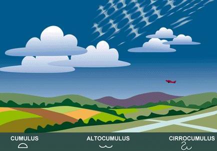 Clouds There are two fundamental types of clouds. First, those formed by vertical currents carrying moist air upward to its condensation point are lumpy or billowy and are called “cumulus,” which means an “accumulation” or a “pile.” Second, those which develop horizontally and lie in sheets or formless layers like fog are called “stratus,” which means “spread out.” [Figures 5-18 and 5-19] |