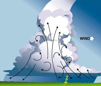 Within the cloud and directly beneath it are updrafts and downdrafts. In the rear portion is a strong downdraft which becomes a wind blowing away from the cloud.