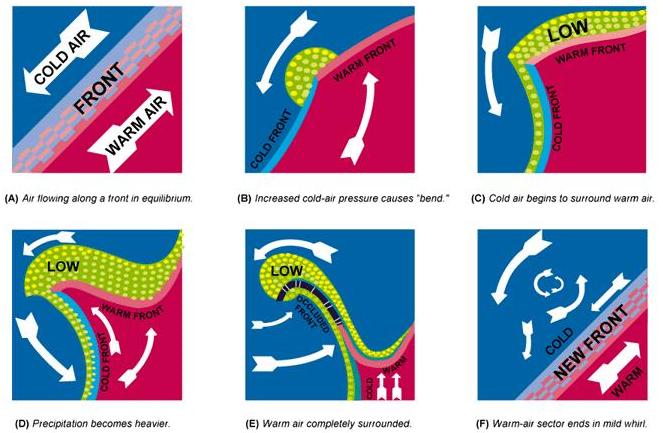 The first stage (A) represents a boundary between two air masses, the cold and warm air moving in opposite directions along a front. Soon, however, the cooler air, being more aggressive, thrusts a wedge under the warm air, breaking the continuity of the boundary, as shown in (B). Once begun, the process continues rapidly to the complete occlusion as shown in (C). As the warmer air is forced aloft, it cools quickly and its moisture condenses, often causing heavy precipitation. The air becomes extremely turbulent, with sudden changes in pressure and temperature. |
