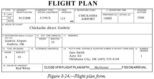 | Figure 8-24 shows the flight plan form a pilot files with the Flight Service Station. When filing a flight plan by telephone or radio, give the information in the order of the numbered spaces. This enables the FSS specialist to copy the information more efficiently. Most of the spaces are either self-explanatory or nonapplicable to the VFR flight plan (such as item 13). However, some spaces may need explanation. |