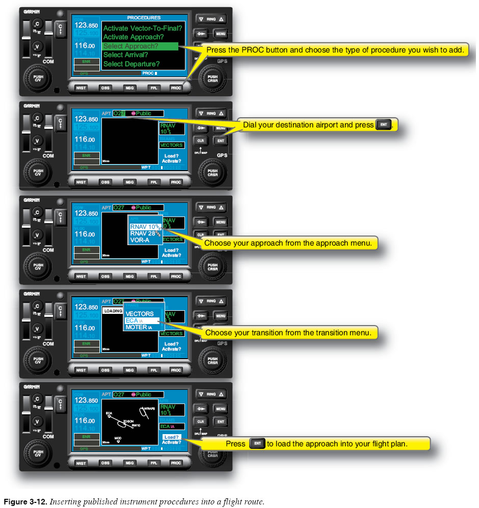 Entering Procedures Every IFR-capable FMS offers a menu of published instrument procedures, such as departures, arrivals, and approaches. When you choose one of these procedures, the FMS automatically inserts all waypoints included in that procedure into the flight plan. Figure 3-12 illustrates how you might choose an approach procedure using one popular FMS.