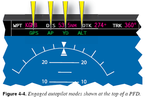 Miscellaneous Autopilot Topics Autopilot Mode Awareness In addition to performing the basic aircraft control and navigation function described previously, some autopilots are capable of automatically switching from one function to another. These automatic mode changes can complicate the task of maintaining mode awareness, but every autopilot has some form of flight mode annunciator that shows which autopilot functions are currently engaged. The autopilot shown in Figure 4-4 displays the name of any autopilot mode that is currently engaged just above the button used to engage the function. It is important to develop two habits: