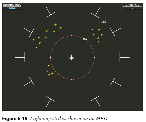 Lightning Most MFDs are also capable of depicting electrical activity that is indicative of lightning. Like radar data, lightning data can come from two sources: onboard and broadcast weather systems. Both systems have strengths and limitations and work together to present a more complete weather picture. Lightning data is an excellent complement to radar data for detecting the presence of thunderstorms. An onboard lightning detection system consists of a simple antenna and processing unit that senses electrical discharges in the atmosphere and attempts to determine which electromagnetic signals have the “signature” of lightning strikes. Lightning detectors or spherics receivers, such as Stormscope® and Strikefinder ®, have been known to indicate areas of static consistent with turbulence even where there was no rain associated with the turbulence. The MFD in Figure 5-16 depicts lightning strikes detected by a lightning detection system. Onboard lightning detection systems provide real-time information about electrical discharges. Estimates of the direction (or azimuth) of electrical discharges provided by an onboard lightning system are usually quite accurate. Estimates of the range (or distance) of electrical discharges tend to be less accurate.