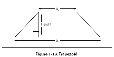 Trapezoid A trapezoid is a four-sided figure with one pair of parallel sides. [Figure 1-18] The formula for the area of a trapezoid is: Area = 1/2 (Base1 + Base2) x Height