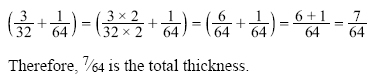 If the fractions do not have the same denominator, then one or all of the denominators must be changed so that every fraction has a common denominator. Example: Find the total thickness of a panel made from 3/32-inch thick aluminum, which has a paint coating that is 1/64-inch thick. To add these fractions, determine a common denominator. The least common denominator for this example is 1, so only the first fraction must be changed since the denominator of the second fraction is already 64.