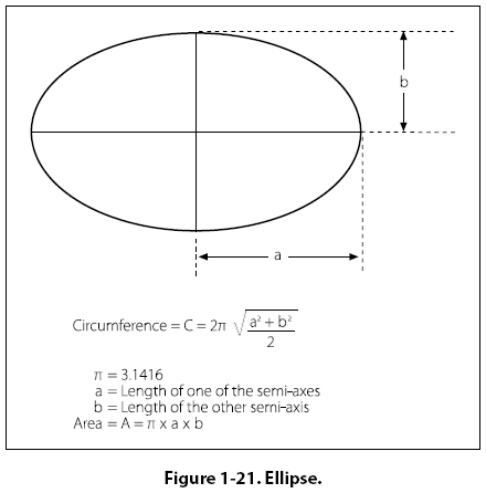The diameter is 5 inches, so the radius is 2.5 inches. (diameter = radius x 2) A = 3.1416 x (2.5 inches)2 = 3.1416 x 6.25 square inches = 19.635 square inches Ellipse An ellipse is a closed, curved, plane figure and is commonly called an oval. [Figure 1-21] In a radial engine, the articulating rods connect to the hub by pins, which travel in the pattern of an ellipse (i.e., an elliptical or obital path).