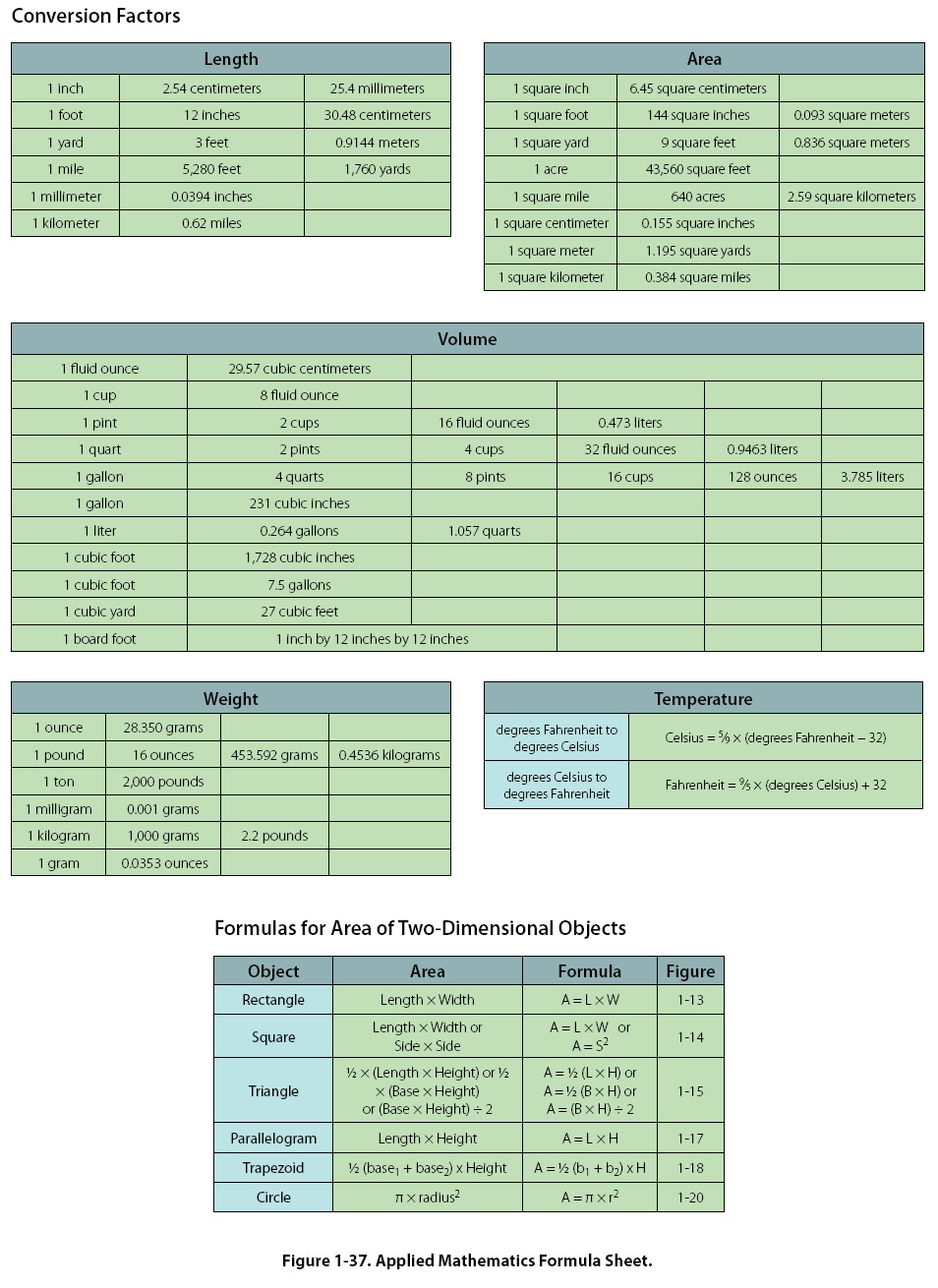 Units of Volume Since all volumes are not measured in the same units, it is necessary to know all the common units of volume and how they are related to each other. For example, the mechanic may know the volume of a tank in cubic feet or cubic inches, but when the tank is full of gasoline, he or she will be interested in how many gallons it contains. Refer to Figure 1-37, Applied Mathematics Formula Sheet, at the end of the chapter for a comparison of different units of volume.