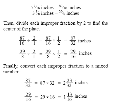 Example: In Figure 1-2, the center of the hole is in the center of the plate. Find the distance that the center of the hole is from the edges of the plate. To find the answer, the length and width of the plate should each be divided in half. First, change the mixed numbers to improper fractions: