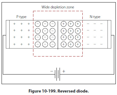 Reverse Biased Diode When the battery is turned around as shown in Figure 10-199, then the diode is reverse biased and current will not flow. The most noticeable effect seen in this illustration is the widened depletion zone.