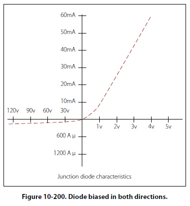 The applied battery voltage is in the same direction as the depletion zone field. Because of this, holes and electrons tend to move away from the junction. Simply stated, the negative terminal attracts the holes away from the junction, and the positive terminal attracts the electrons away from the barrier. Therefore, the result is a wider depletion zone. This action increases the barrier width because there are more negative ions on the P-side of the junction and more positive ions on the N-side of the junction. This increase in the number of ions at the junction prevents current flow across the barrier by the majority carriers. To summarize, the important thing to remember is that these PN junction diodes will offer very little resistance to current in a forward biased diode. Maximum resistance will happen when the diode is reversed biased. Figure 10-200 shows a graph of the current characteristics of a diode that is biased in both directions.