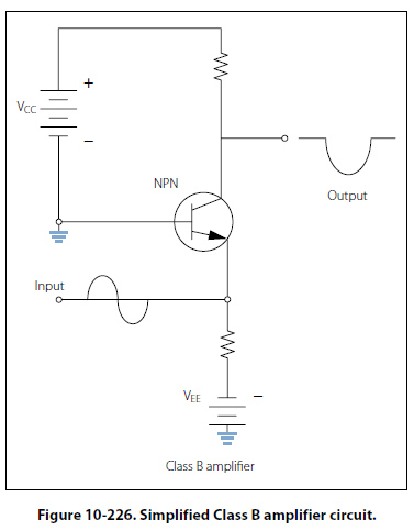 Class B Figure 10-226, shows a simplified Class B amplifier circuit. In Class B operation, the transistor current flows for only 50 percent of the input signal. In this illustration, the base-emitter bias will not allow the transistor to conduct whenever the input signal is greater than zero. In this case, only the negative portion of the input signal will be reproduced. Unlike the rectifier, the Class B amplifier will not only reproduce half of the input signal, but it will also amplify it. Class B amplifiers are twice as efficient as the Class A amplifier because the amplifying device only uses power for half of the input signal.