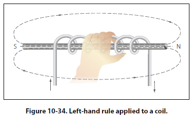 wire loops, or turns, is called an electromagnet, since the poles (ends) of the coil possess the characteristics of a bar magnet. The addition of the soft iron core does two things for the current carrying coil. First, the magnetic flux is increased, and second, the flux lines are more highly concentrated. When direct current flows through the coil, the core will become magnetized with the same polarity (location of north and south poles) as the coil would have without the core. If the current is reversed, the polarity will also be reversed. The polarity of the electromagnet is determined by the left-hand rule in the same manner as the polarity of the coil without the core was determined. If the coil is grasped in the left hand in such a manner that the fingers curve around the coil in the direction of electron flow (minus to plus), the thumb will point in the direction of the north pole. [Figure 10-34]