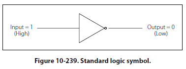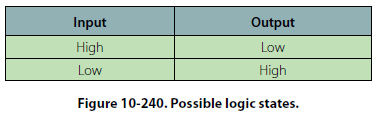 Basic Logic Circuits Boolean logic is a symbolic system used in representing the truth value of statements. It is employed in the binary system used by digital computers primarily because the only truth values (true and false) can be represented by the binary digits 1 and 0. A circuit in computer memory can be open or closed, depending on the value assigned to it. The fundamental operations of Boolean logic, often called Boolean operators, are “and," “or," and “not"; combinations of these make up 13 other Boolean operators. Six of these operators are discussed. The Inverter Logic The inverter circuit performs a basic logic function called inversion. The purpose of the inverter is to convert one logic state into the opposite state. In terms of a binary digit, this would be like converting a 1 to a 0 or a 0 to a 1. When a high voltage is applied to the inverter input, low voltage will be the output. When a low voltage is applied to the input, a high voltage will be on the output. This operation can be put into what is known as a logic or truth table. Figure 10-240 shows the possible logic states for this gate. The standard logic symbol is shown in Figure 10-239. This is the common symbol for an amplifier with a small circle on the output. This type of logic can also be considered a NOT gate.