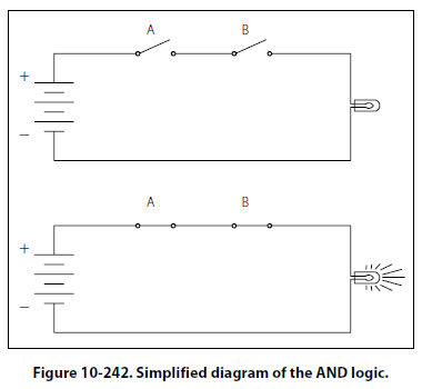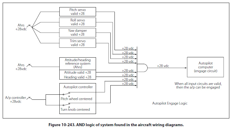 Notice that both switches need to be closed in order for the light bulb to turn on. Any other combination of switch positions will be an open circuit and the light will not turn on. An example of AND logic could possibly be engage logic, found in an autopilot. In this case, the autopilot would not be allowed to be engaged unless certain conditions are first met. Such conditions could be: Vertical gyro is valid AND directional gyro is valid AND all autopilot control knobs are in detents AND servo circuits are operational. Only when these conditions are met will the autopilot be engaged. Figure 10-243 shows the logic of this system found in the aircraft wiring diagrams.