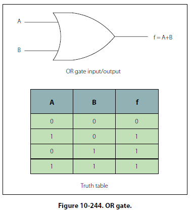 The OR Gate The OR gate has two or more inputs and one output, and is normally represented by the standard logic symbol and truth table as shown in Figure 10-244. In this Figure, notice that the OR gate can have any number of inputs as long as it is greater than one.