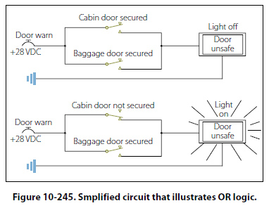 is a simplified circuit that illustrates the OR logic. The example used is a “DOOR UNSAFE" annunciator. Let’s say in this case that the plane has one cabin door and a baggage door. In order for the annunciator light on the master warning panel to extinguish, both doors must be closed and locked. If any one of the doors is not secured properly, the baggage door OR the cabin door, then the “DOOR UNSAFE" annunciator will illuminate. In this case, two switches are in parallel with each other. If either one of the two switches is closed, the light bulb will light up. The lamp will be off only when both switches are open. |