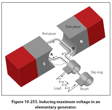 This simple generator is illustrated in Figure 10-255, together with the components of an external generator circuit which collect and use the energy produced by the simple generator. The loop of wire (A and B of Figure 10-255) is arranged to rotate in a magnetic field. When the plane of the loop of wire is parallel to the magnetic lines of force, the voltage induced in the loop causes a current to flow in the direction indicated by the arrows in Figure 10-255. The voltage induced at this position is maximum, since the wires are cutting the lines of force at right angles and are thus cutting more lines of force per second than in any other position relative to the magnetic field. As the loop approaches the vertical position shown in Figure 10-256, the induced voltage
