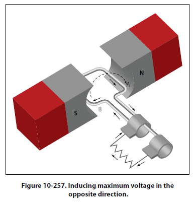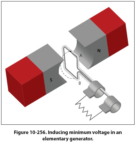 decreases because both sides of the loop (A and B) are approximately parallel to the lines of force and the rate of cutting is reduced. When the loop is vertical, no lines of force are cut since the wires are momentarily traveling parallel to the magnetic lines of force, and there is no induced voltage. As the rotation of the loop continues, the number of lines of force cut increases until the loop has rotated an additional 90° to a horizontal plane. As shown in Figure 10-257, the number of lines of force cut and the induced voltage once again are maximum.