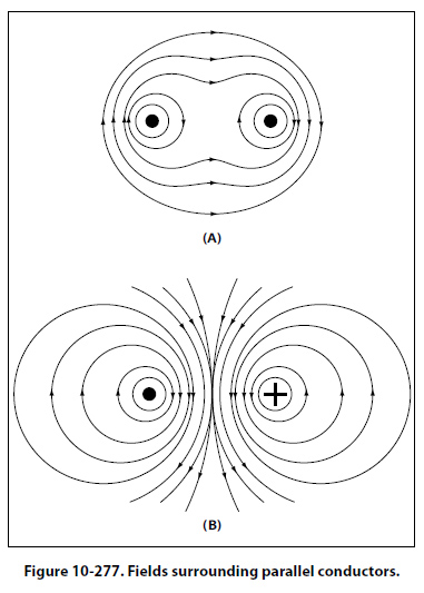 Force between Parallel Conductors Two wires carrying current in the vicinity of one another exert a force on each other because of their magnetic fields. An end view of two conductors is shown in Figure 10-277. In A, electron flow in both conductors is toward the reader, and the magnetic fields are clockwise around the conductors. Between the wires, the fields cancel because the directions of the two fields oppose each other. The wires are forced in the direction of the weaker field, toward each other. This force is one of attraction. In B, the electron flow in the two wires is in opposite directions.