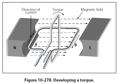 The magnetic fields are, therefore, clockwise in one and counterclockwise in the other, as shown. The fields reinforce each other between the wires, and the wires are forced in the direction of the weaker field, away from each other. This force is one of repulsion. To summarize: conductors carrying current in the same direction tend to be drawn together; conductors carrying current in opposite directions tend to be repelled from each other. Developing Torque If a coil in which current is flowing is placed in a magnetic field, a force is produced which will cause the coil to rotate. In the coil shown in Figure 10-278, current flows inward on side A and outward on side B. The magnetic field about B is clockwise and that about A, counterclockwise. As previously explained, a force will