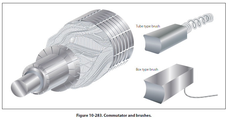 Field Assembly The field assembly consists of the field frame, the pole pieces, and the field coils. The field frame is located along the inner wall of the motor housing. It contains laminated soft steel pole pieces on which the field coils are wound. A coil, consisting of several turns of insulated wire, fits over each pole piece and, together with the pole, constitutes a field pole. Some motors have as few as two poles, others as many as eight. Brush Assembly The brush assembly consists of the brushes and their holders. The brushes are usually small blocks of graphitic carbon, since this material has a long service life and also causes minimum wear to the commutator. The holders permit some play in the brushes so they can follow any irregularities in the surface of the commutator and make good contact. Springs hold the brushes firmly against the commutator. A commutator and two types of brushes are shown in Figure 10-283.