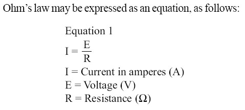 Where I is current in amperes, E is the potential difference measured in volts, and R is the resistance measured in ohms. If any two of these circuit quantities are known, the third may be found by simple algebraic transposition. With this equation, we can calculate current in a circuit if the voltage and resistance are known. This same formula can be used to calculate voltage. By multiplying both sides of the equation 1 by R, we get an equivalent form of Ohm’s law, which is: Equation 2 Finally, if we divide equation 2 by I, we will solve for resistance, Equation 3 All three formulas presented in this section are equivalent to each other and are simply different ways of expressing Ohm’s law. The various equations, which may be derived by transposing the basic law, can be easily obtained by using the triangles in Figure 10-39.