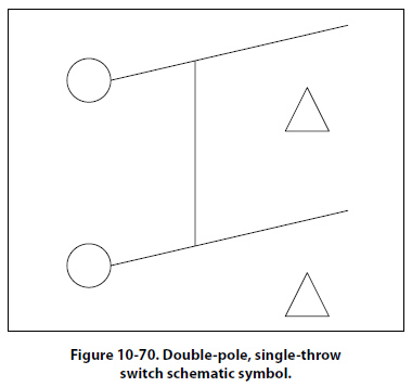Double-Pole, Single-Throw (DPST) The double-pole, single-throw switch connection can be made between one set of contacts and either of two other sets of contacts. The schematic symbol for this switch is shown in Figure 10-70.
