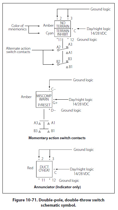 Arc Fault Circuit Breaker In recent years, the arc fault circuit breaker has begun to provide an additional layer of protection beyond that of the thermal protection already provided by conventional circuit breakers. The arc fault circuit breaker monitors the circuit for an electrical arcing signature, which can indicate possible wiring faults and unsafe conditions. These conditions can lead to fires or loss of power to critical systems. The arc fault circuit breaker is only beginning to make an appearance in the aircraft industry and is not widely used like the thermal type of circuit breaker. Thermal Protectors A thermal protector, or switch, is used to protect a motor. It is designed to open the circuit automatically whenever the temperature of the motor becomes excessively high. It has two positions — open and closed. The most common use for a thermal switch is to keep a motor from overheating. If a malfunction in the motor causes it to overheat, the thermal switch will break the circuit intermittently. The thermal switch contains a bimetallic disk, or strip, which bends and breaks the circuit when it is heated. This occurs because one of the metals expands more than the other when they are subjected to the same temperature. When the strip or disk cools, the metals contract and the strip returns to its original position and closes the circuit. Control Devices Components in the electrical circuits are typically not all intended to operate continuously or automatically. Most of them are meant to operate at certain times, under certain conditions, to perform very definite functions. There must be some means of controlling their operation. Either a switch, or a relay, or both may be included in the circuit for this purpose. Switches Switches control the current flow in most aircraft electrical circuits. A switch is used to start, to stop, or to change the direction of the current flow in the circuit. The switch in each circuit must be able to carry the normal current of the circuit and must be insulated heavily enough for the voltage of the circuit. An understanding of some basic definitions of the switch is necessary before any of the switch types are discussed. The number of poles, throws, and positions they have designates toggle switches, as well as some other type of switches. Pole: the switch’s movable blade or contactor. The number of poles is equal to the number of circuits, or paths for current flow, that can be completed through the switch at any one time. Throw: indicates the number of circuits, or paths for current, that it is possible to complete through the switch with each pole or contactor. Positions: indicates the number of places at which the operating device (toggle, plunger, and so forth) will come to rest and at the same time open or close one or more circuits. Toggle Switch Single-Pole, Single-Throw (SPST) The single-pole, single-throw switch allows a connection between two contacts. One of two conditions will exist. Either the circuit is open in one position or closed in the other position. The schematic symbol for this switch is shown in Figure 10-68.