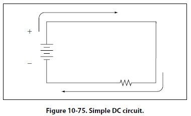 both schematic and pictorial format. When a voltage is applied to the coil of the relay, the electromagnet will be energized due to the current. When energized, an electromagnetic field will pull the common (C) or arm of the relay down. When the arm or common is pulled down, the circuit between the arm and the normally closed (NC) contacts is opened and the circuit between the arm and the normally open (NO) contacts are closed. When the energizing voltage is removed, the spring will return the arm contacts back to the normally closed (NC) contacts. The relay usually has two connections for the coil. The (+) side is designated as X1 and the ground-side of the coil is designated as X2. Series DC Circuits Introduction The series circuit is the most basic electrical circuit and provides a good introduction to basic circuit analysis. The series circuit represents the first building block for all of the circuits to be studied and analyzed. Figure 10- 75 shows this simple circuit with nothing more than a voltage source or battery, a conductor, and a resistor. This is classified as a series circuit because the components are connected end-to-end, so that the same current flows through each component equally. There is only one path for the current to take and the battery and resistor are in series with each other. Next is to make a few additions to the simple circuit in Figure 10-75.
