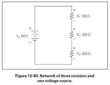 The voltage drop across any particular resistor shall be called EX, where the subscript x is the value of a particular resistor (1, 2, 3, or 4). Using Ohm’s law, the voltage drop across any resistor can be determined. Ohm’s law: EX = I (RX) As seen earlier in the text, the current is equal to the source voltage divided by the total resistance of the series circuit. Current: I = ES/RT The current equation can now be substituted into the equation for Ohm’s law. Substitute: Ex =(Es/Rt)(Rx) This equation is the general voltage divider formula. The explanation of this formula is that the voltage drop across any resistor or combination of resistors in a series circuit is equal to the ratio of the resistance value to the total resistance, divided by the value of the source voltage. Figure 10-89 illustrates this with a network of three resistors and one voltage source.